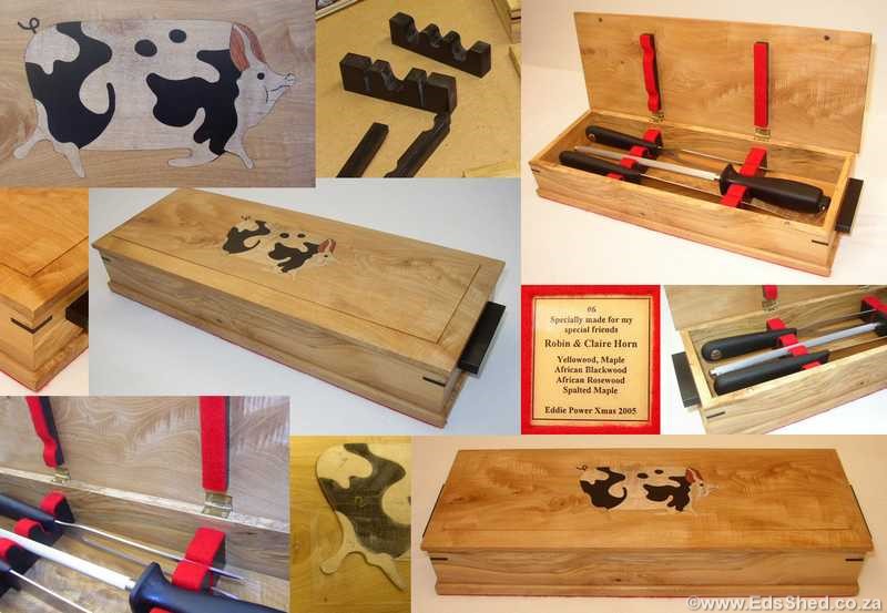 For my dear friends Claire and Robin Horn for Christmas 2005. Yellowwood, Maple, African Blackwood, African Rosewood, Spalted Maple. February to December 2005.